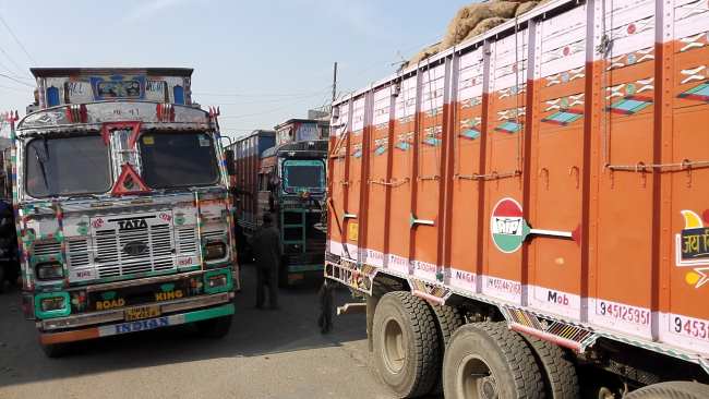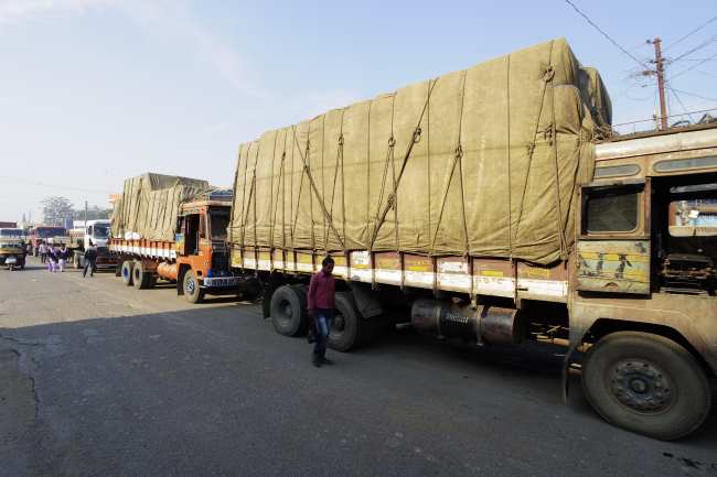 国境のインド側に入ると、ブロッケードのため、長蛇の列となっているトラックの果てしない車列が続いている。