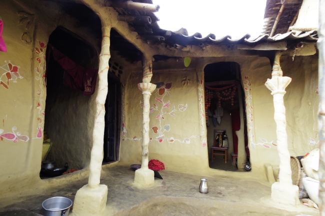 その人物は、地域のマイクロファイナンスの仕事をしているのだとか。この方の家の中庭で伺った話によると、『昔はみんなやっていたけどねぇ。ちょうどディーパーワリーあたりの頃に女性たちがそうやって飾り立てていた。今は現金収入の手段として描く人が多くなったね。』とのこと。また、これまでなかったモノや習慣が村に入ってくるのは、いわゆるグローバル化の側面だが、元々他の地域ではやらないことを自分たちもやらなくなってしまうという面もあるね、とも。