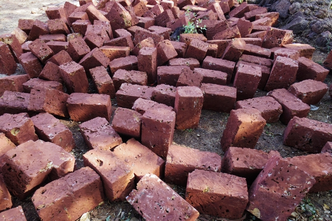 マハーラーシュトラ州南部からゴアにかけて、いわゆるコーンカーン地域では、ラテライト質の土壌から、大地が赤く見える。当地の典型的な石建材はこれ。気泡のようなものが入っており、切り出しても表面がデコボコの石。比較的硬度は低いようで、加工はしやすそうだ。