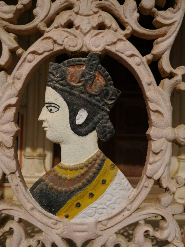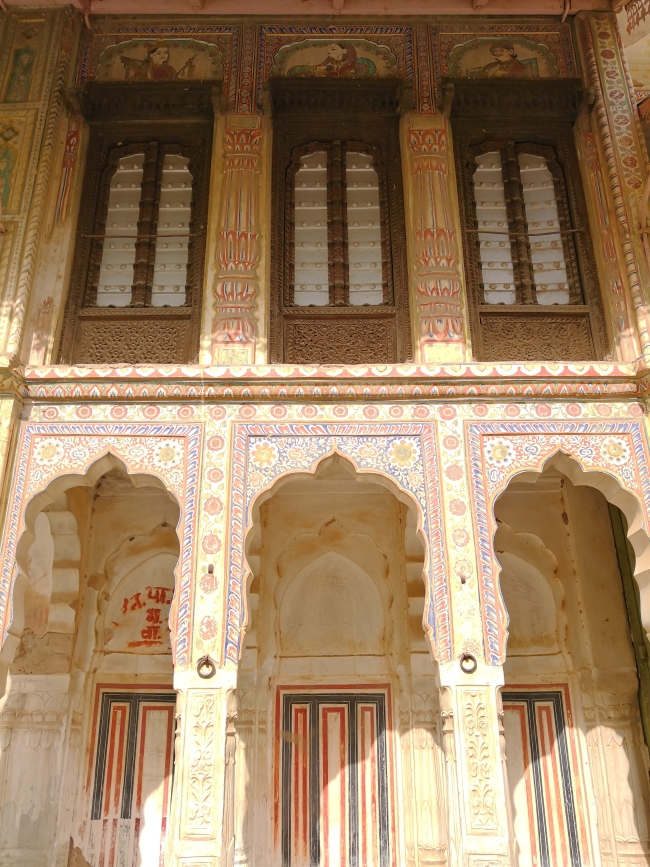 ハヌマーン・プラサード・ネーヴティヤー・ハヴェリー 次に訪れたのはファテープル。 こちらはハヌマーン・プラサード・ネーヴティヤー・ハヴェリー。外に面したバルコニーに鉄の欄干を持つという珍しい形だが、その欄干に人の顔が刻まれている。ファテープルでは、こういう鉄の欄干、そしてそこに人の顔あるいは神の姿をあしらうといったものがしばしば見られる。 ちょうど管理人がどこかから帰ってきたところで、見学してみたがとても良かった。保存状態は良好。出来ることならば、この屋敷をひと月くらい借りて生活してみたいものだ。 屋上の構造物。この屋敷の中では時代が最も下ってから造られた部分らしく、洋風の意匠を志向した形跡が認められる。