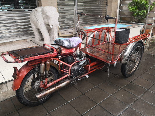 バイクの前に荷台車を付けた改造車。ジュガールな手法が生きていたころのタイの名残り。昔はよく見かけたものだが、近年はめっきり数が減ったとはいえ、まだバンコクでもたまに見かけるというか、荷物運搬のためにまだ少なからず走っている。今さらながら驚いたのだが、これらにはナンバープレートがないのだ。「自転車の扱い」なのだろうか。