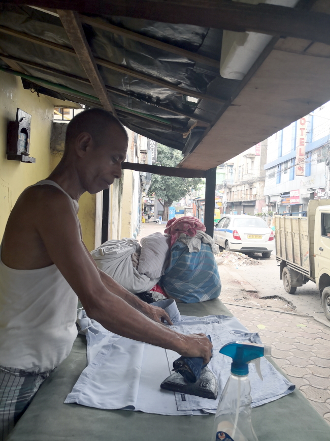 傍らの火鉢の中で熱せられたアイロン。年季の入った質実剛健な仕事道具。 ワイシャツ2枚かけたら取り替えるとのことで、なかなか面倒な気はするが、露店のアイロン屋は黙々とシャツをプレスしていく。 朝から夕方まで、来る日も来る日も・・・。