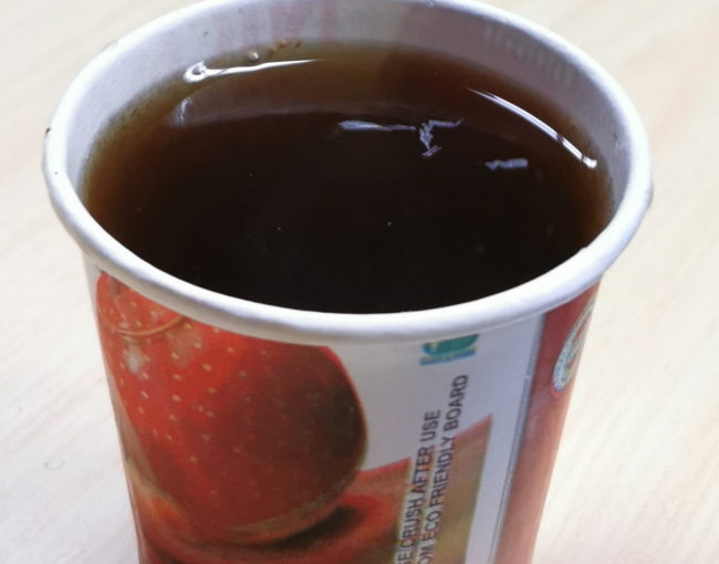 西ベンガル州内で鉄道車内によく売りに来るラール・チャー(文字通り紅茶)。ジンジャーティーである場合が多いが、汗を思わせるような匂いのマサーラーを入れたものもある。その場合、生姜は使用されない。いずれも美味で、ときにはチャーイでなく、こういうお茶も良いと思う。