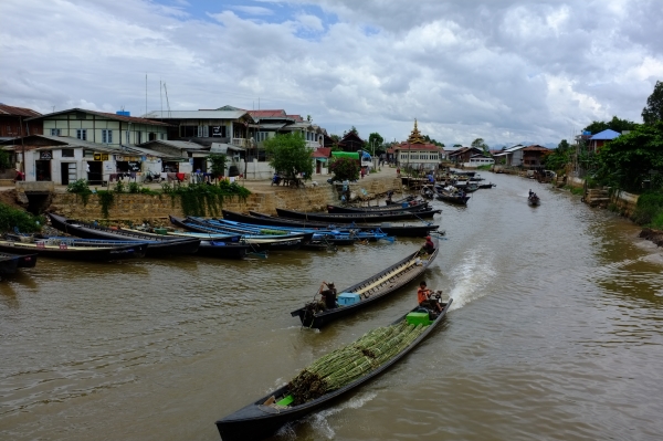 ホテルを出て通りを左に直進したところにインレー湖につながる運河の船着場がある。両岸は土が崩れ落ちないように竹で護岸がなされている。ところどころで浚渫作業が進行中。放っておくと浅くなってしまい、船の往来に支障を来たすようになるのだろう。