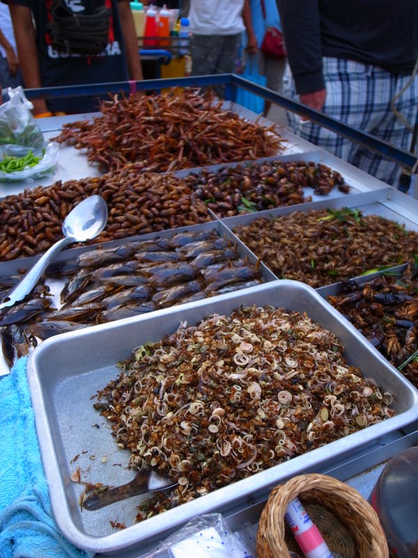 食べ物や飲み物等の様々な屋台が出ているカオサン通りだが、夕方になると昆虫専門屋台も出ている。飼育用ではなくすべて食用で、すでに調理済みだ。タイでもイサーン(東北)地方ではもともと昆虫を食用とする例は多いが、もちろんここでは好奇心旺盛な外国人たちが顧客である。