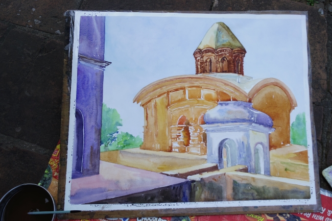 13本の塔を持つハンセースワーリー寺院とテラコッタの装飾が見事なアナンタ・ワスデーヴ寺院を見学。すぐ隣にはラージバーリーがあり、なかなか絵になるセッティングだ。絵といえば、境内で水彩画を描いている女性がいたので、いろいろ質問しながらしばらく見物。とかくベンガルでは、若い人から年配者まで、絵画、音楽、写真、演劇その他の趣味に熱烈に傾倒する人が多く、文化的な感じがする。