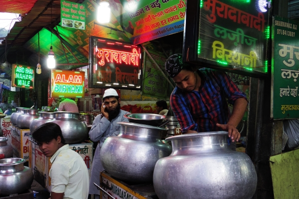 ダルガーの参道にはずらりと巨大な釜を並べるビリヤーニー専門店が並ぶ横丁がある。このあたりにKarim’sよりも旨いビリヤーニーを出す店がきっとあることだろう。付近にはティッカーやケバーブ、様々なナーンの類などを売る店も多く、これまた食欲を大いにそそる一角である。
