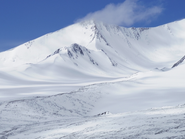 あとひとガンバリで峠頂上というあたりまで来ると回りは雪だらけになる。今日はカンヤツェも頂上まで顔を出してくれている。天候としてはまずまずである。昨夜の雨がウソのようだ。このあたりはすでに海抜5,200メートル近いので。歩みが遅くなり息が上がる。さりとて苦しいとか大変というほどではないのだが。さきほどの斜面でフランス人の還暦夫婦を追い越したのだが、しばらく峠で写真などを撮影していると、やがて彼らもここにやってきた。