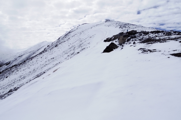 キャンプ場の手前にある川の橋を越えてから上へ上へと斜面を登る。雲で朝日は見えないが、少し登ったあたりから残雪がところどころ見られる。あるいは昨日降った雨はここでは雪だったのかもしれない。最初の登りはけっこう急だが、しばらく登ると少し緩やかになる。そしてコンマル・ラへの最後の斜面はかなり勾配だ。