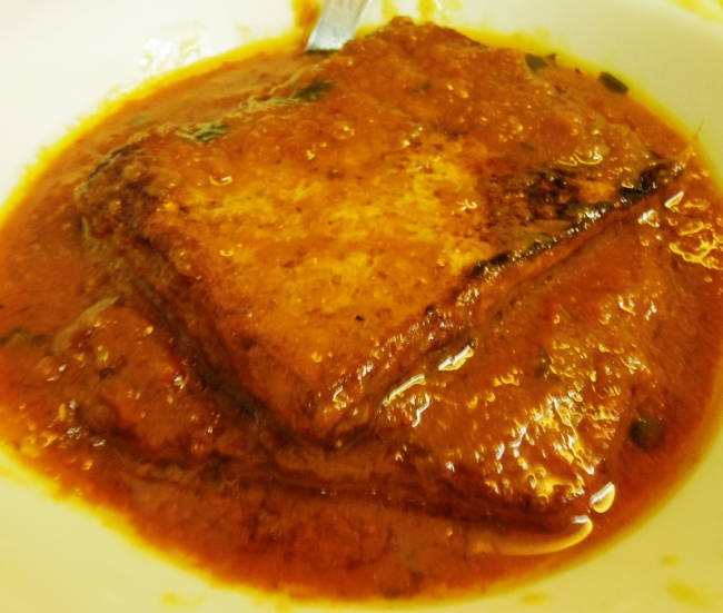 出てきた料理のひとつにこういうものがあった。大きな豆腐ステーキ風のパニールがトマト風味のグレービーに入っているもの。