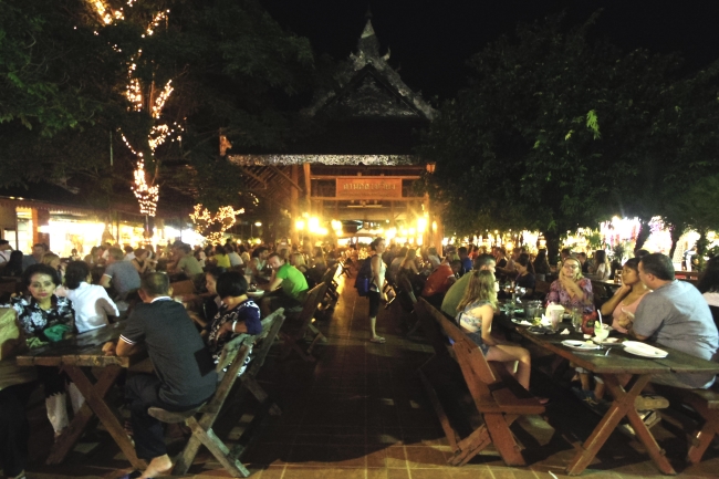 街の規模にくらべてずいぶん盛大なナイトマーケットであることに驚く。おそらくここでの商売を専業とする者もあるのだろう。人ごみの中に地元の人たちがどのくらいいるのかは知らないが、おそらくマジョリティはタイ人を含めた観光客であろうことは想像できる。このエリアすべてがナイトマーケットの会場となっているだけでなく、ステージも出ていて演奏がなされている。