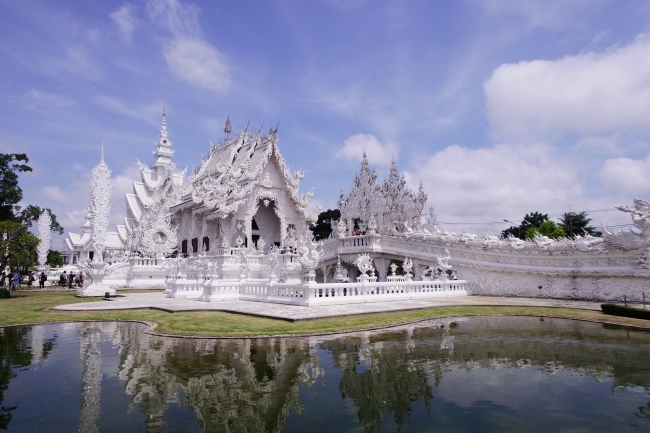 Wat Rong Khunへ。チェンラーイ出身のアーティストで華人でもあるChalermchai Kositpipat,氏が建てた白い寺がある。別名「ホワイト・テンプル」で知られるように、すべてが白く塗られている。カラフルな寺院が多いタイにあって、何から何まで白い寺院というのは見たこともない。