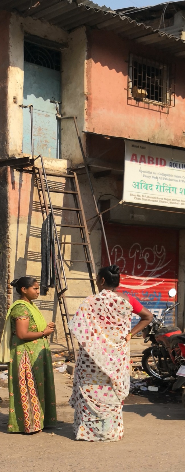 こんなエリアなのに路肩にはなぜかロイヤルエンフィールドの若者向けのカッコいいバイクが置かれていたり、こうした家屋のハシゴから降りてくる青年が大型画面のスマホを手にしていたりする。こんなスラムだが、けっこう大きな金額が日々動いており、けっこう可処分所得の高い個人、世帯もあるとは聞くのだが。