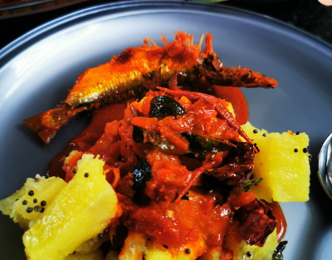 カッパーをイワシの煮物とともに。ボンベイのフォート地区のケーララ料理店にて。この取り合わせは、なかなか見栄えがする。ともに鮮やかなオレンジ色と黄色。歯の間にグサグサと入ってくる小骨を感じながら、ホクホクのカッパーと塩味の効いたグレイビーのコンビネーションを楽しむ至福の昼下がり。
