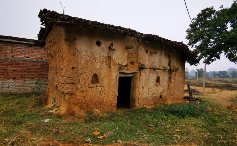 午後はムンダーの人たちが暮らすイスコーの村、そしてジョラーカートの村へ。やはり土造りの家は手入れがなかなか大変なようで、しばらく放置されていると、このようになってしまう。背後にはレンガ積みの建物があり、やはりこちらのほうがはるかに耐久性は高そうだ。